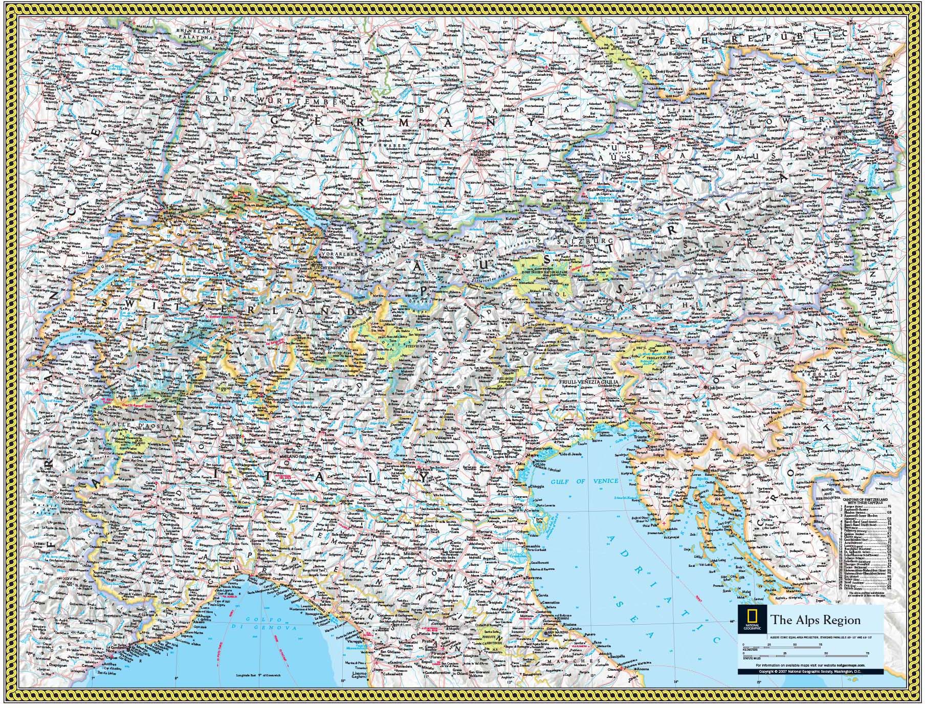 National Geographic's Adventure Map of the Alps is an invaluable tool for travelers seeking to explore the iconic mountain range that stretches across eight European countries including Austria, France, Germany, Italy, Liechtenstein, Monaco, Slovenia, and Switzerland.. The Alps extend north from the subtropical Mediterranean coast near Nice, France, to Lake Geneva before trending east-northeast to Vienna.